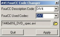 The AVI FourCC Code changer allows you to change the FourCC code in an AVI file. The FourCC code is the identification key used by the AVI format to inform itself of which decoder to use for the AVI file playback.